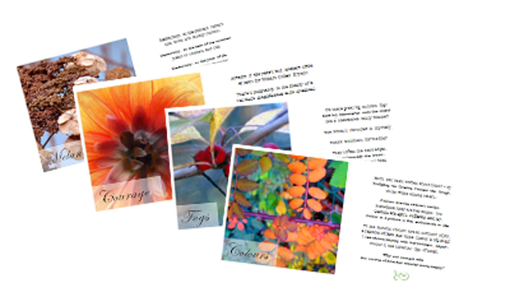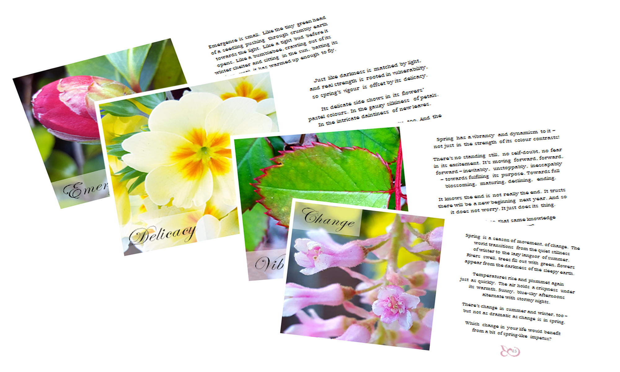 Go with the rhythms of nature, the change of the seasons, more consciously with these gorgeous little books – one for each season. Let Monica’s beautiful original photography and her poetic, reflective texts take you into living each season more deeply and joyfully. Take the pictures and reflections as a starting point to make change for the better in your life. Or just bask in the colour, soak up the wisdom and let these e-booklets make the life you love even more vibrant.