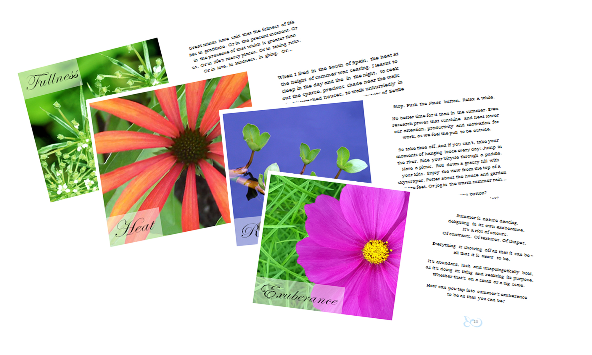 Summer is brightness, sunshine, heat. Long, lazy days of light. Storms of warm winds and rain. It’s the joy of maturing and maturity. It’s fullness and lushness. Make the most of your summer with this beautiful e-Booklet – whether you’re going on summer holiday or not! Tap into its energy and let it enrich your life!